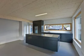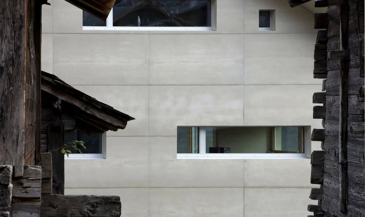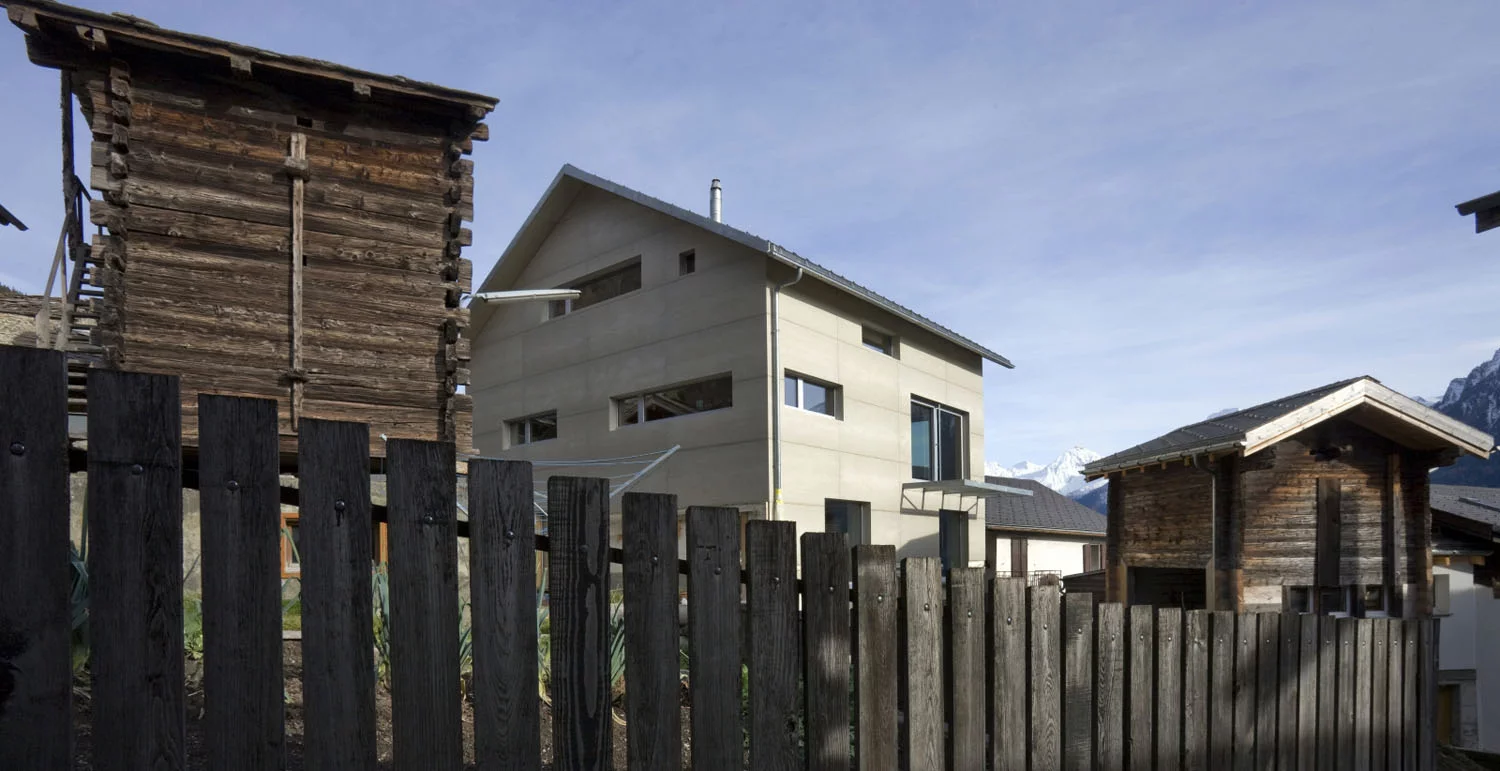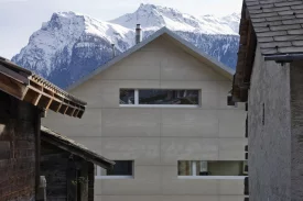 Das bestehende gemauerte Haus mitten in der Dorfzone (alte Bäckerei) genügte den heutigen energetischen und funktionalen Anforderungen nicht mehr. Die oberen zwei Geschosse wurden abgebrochen und durch einen vorfabrizierten Holzbau ersetzt. Die 50 cm dicken Maueren von Unter- und Erdgeschoss blieben bestehen und wurden mit einer Aussenisolation versehen. Die Fassadenbekleidung aus Duripaneelplatten verläuft als Hülle über alle Geschosse bis zum Sockel, sodass ein einheitliches Fassadenbild entsteht. Der moderne Baukörper passt in seiner Farbgebung zu den alten Ställen, die von dunklem Holz und dem Steinsockel geprägt sind.