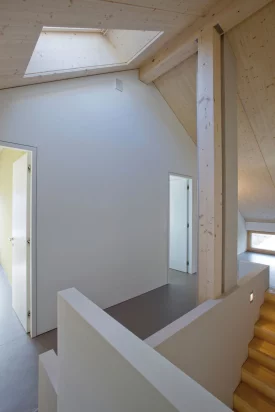 Im Innern ist der Grundriss sehr offen gehalten. Der mittig liegende Treppenkern unterteilt die Geschosse in Schichten: nach Süden liegen Wohnzimmer (1. OG) und Schlafzimmer (Dach), nach Norden die Nass- und Nebenräume. Das Untergeschoss ist über die neue Treppe direkt zugänglich. Im Erdgeschoss bleibt die Werkstatt des Bauherrns bestehen, wo er die Schreinerarbeiten des Baus selber produziert.