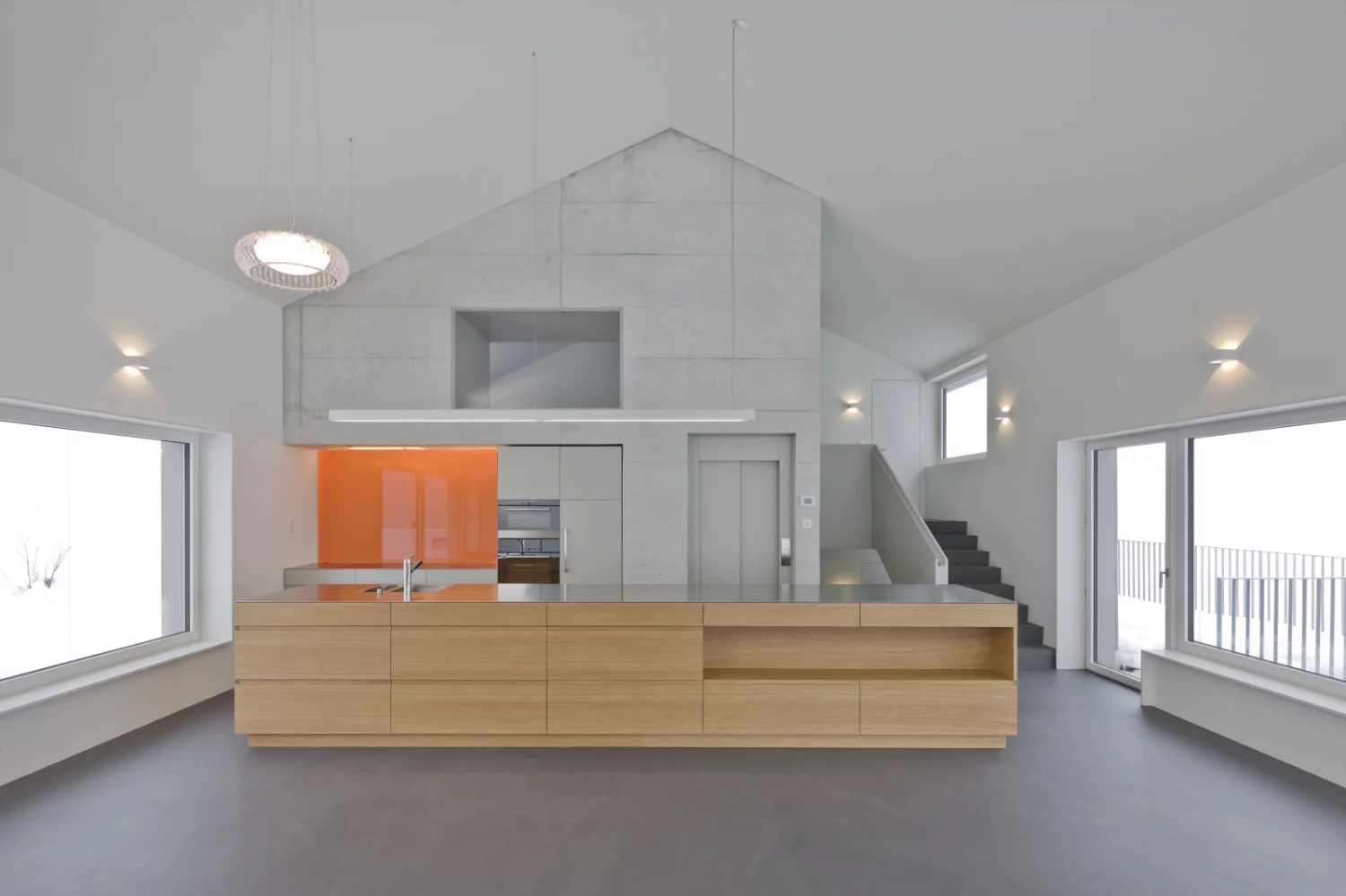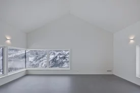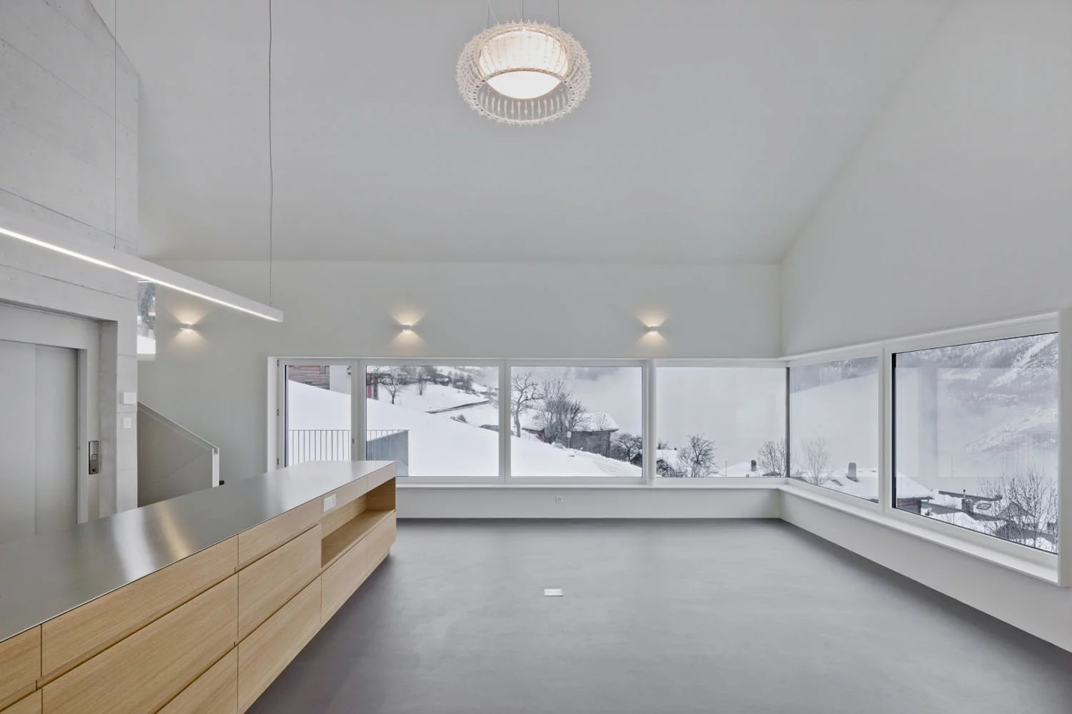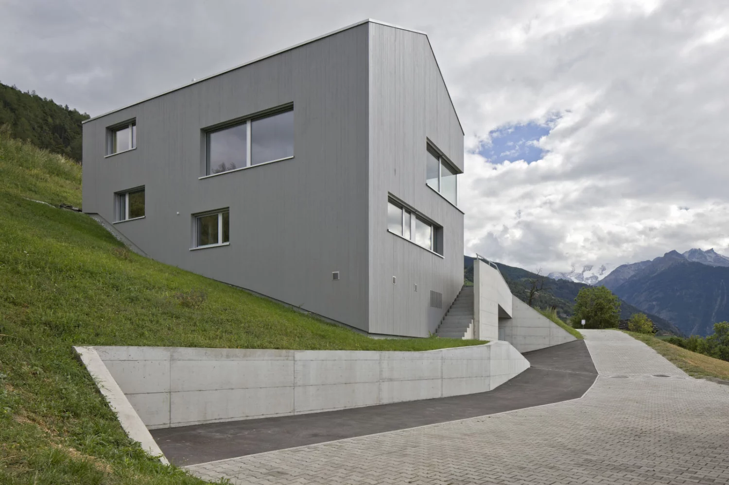 Die Bauherrschaft wollte für sich, nachdem die Kinder ausgezogen waren, den Traum vom Eigenheim verwirklichen. Das längliche Volumen mit Giebel senkrecht zur Hangneigung tritt prägnant in Erscheinung. Das klar geschnittene Volumen ist im Innern mit Splittlevels organisiert so dass man sich langsam den Hang hinauf arbeitet. Zuoberst liegt das überhohe Wohnzimmer, offen bis zum Giebel. Grosse Panoramafenster eröffnen die wunderbare Aussicht nach Zermatt und nach Visp. Die Fassaden aus behandeltem, vertikal geschaltem Lärchenholz geben dem Haus seinen speziellen Ausdruck.