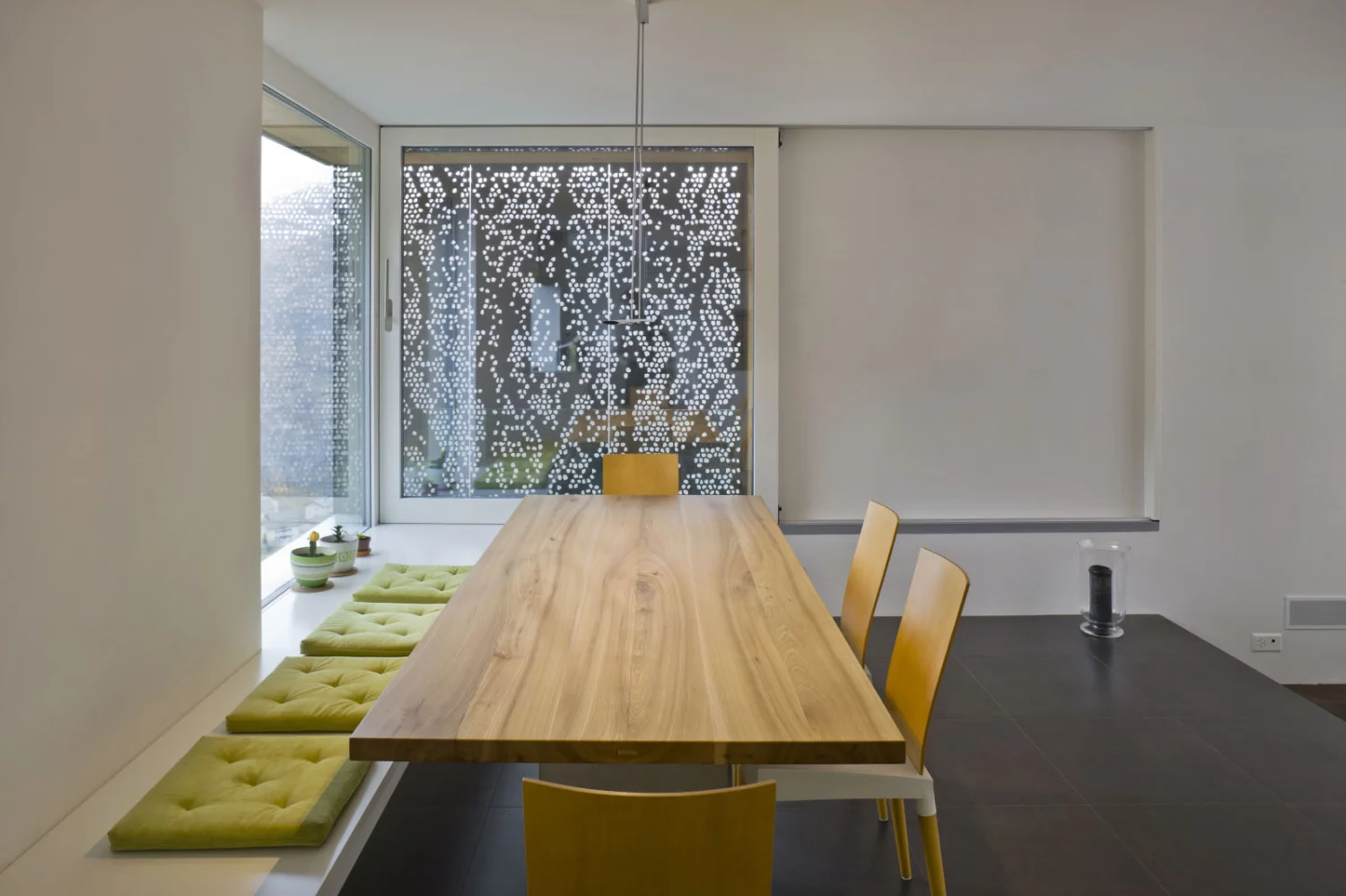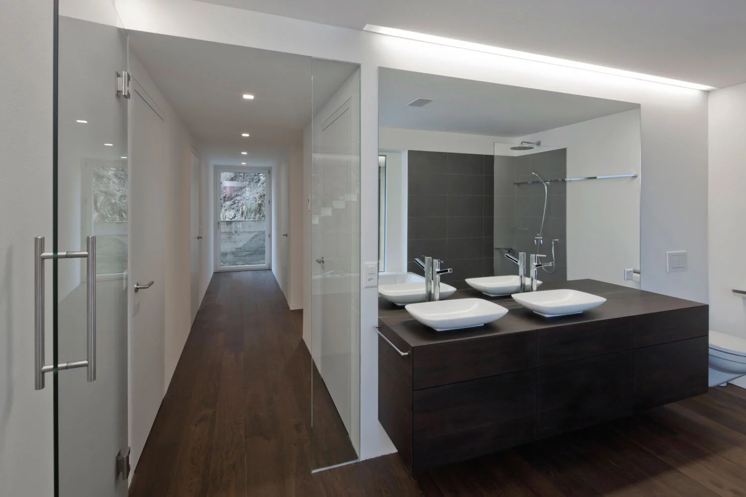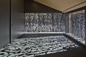 Da die Parzelle unterhalb der Zufahrtstrasse liegt, ist die Einfahrts- und Eingangsebene auf dem obersten Geschoss. Neben der Garage befinden sich Eingang und Garderobe sowie das Arbeitszimmer. Das mittlere Geschoss ist ein offener Raum mit Küche, Essen und Wohnen. Ein Eckfenster bietet Aussicht nach Süden und Westen. Im untersten Geschoss befinden sich die zwei Schlafzimmer, das Bad mit Ausgang auf die unterste Terrasse die Technik.