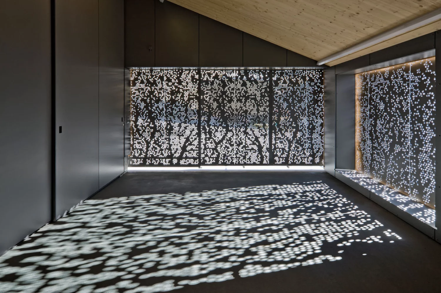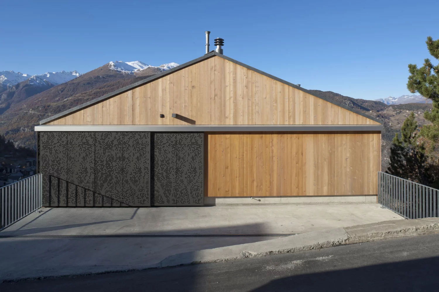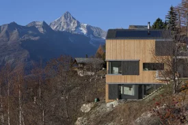 Die Parzelle befindet sich oberhalb des Dorfes an einem 35˚ steilen Süd-West Hang. Dank dieser steilen Hanglage hat das Haus einen 180° - Panoramablick auf die umliegenden Berge. Das Haus folgt der natürlichen Neigung des Terrains – jedes Geschoss ist mit einer Aussenterrasse an die Umgebung angeschlossen.
