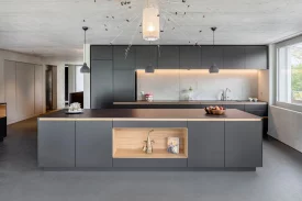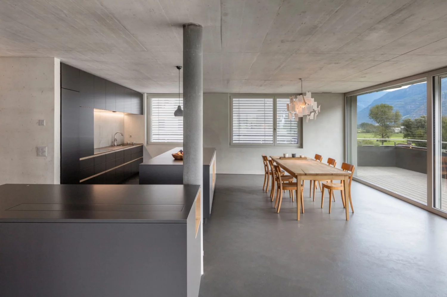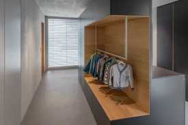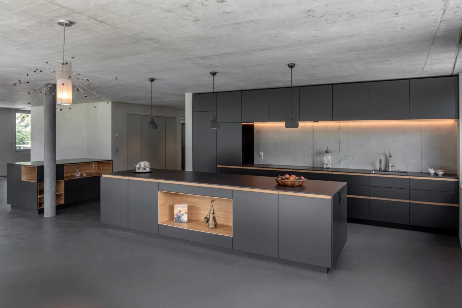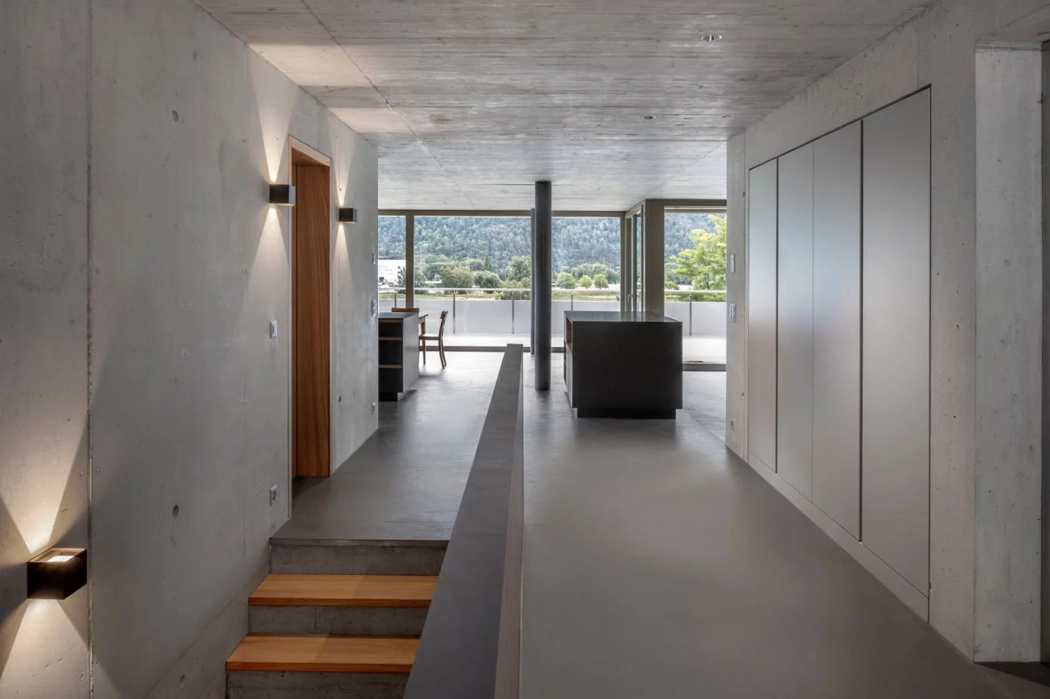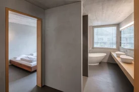 Die Bauherrschaft kaufte zwei Attikawohnungen und legte sie für die fünfköpfige Familie zusammen. Die Aufgabe war der Innenausbau ab Rohbau. Der rückwärtige Teil ist den Kindern vorbehalten, der vordere Teil der Wohnung den Aufenthaltsräumen und dem Elternbereich. Zwischen den Zimmern sind die Räume sehr offen gestaltet. Das Farb- und Materialkonzept wurde naturbezogen gewählt, auf weisse Farbe wurde verzichtet. So sind sämtliche Decken und die raumdefinierenden Kernwände als Sichtbetonwände ausgeführt. Die gemauerten Wände sind mit Lehmputz versehen. Ein homogener, anthrazitfarbener Spachtelboden belegt alle Räume. Die Einbaumöbel sind aus Kastanienholz und dunkel gespritztem MDF gefertigt. Ein Lichtkonzept wurde entwickelt und mittels indirekter Belichtung entsteht eine warme, wohnliche Atmosphäre.Die Dachterrasse mit Holzboden ist über grosse bepflanze Rohstahltröge begrünt.