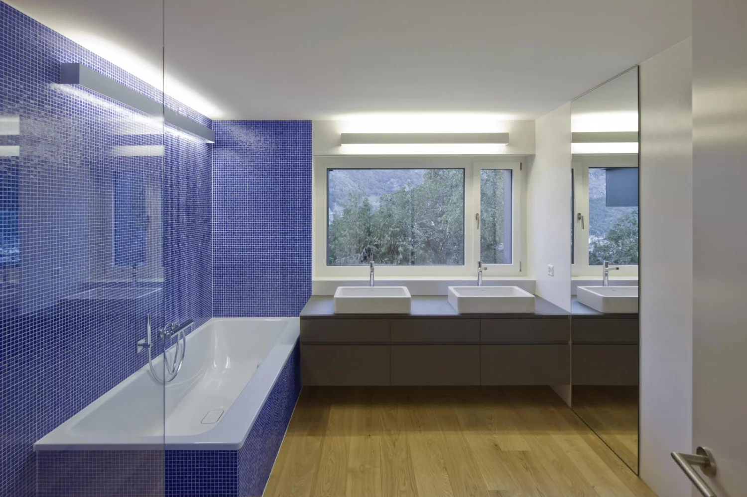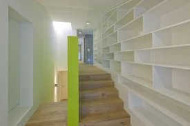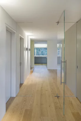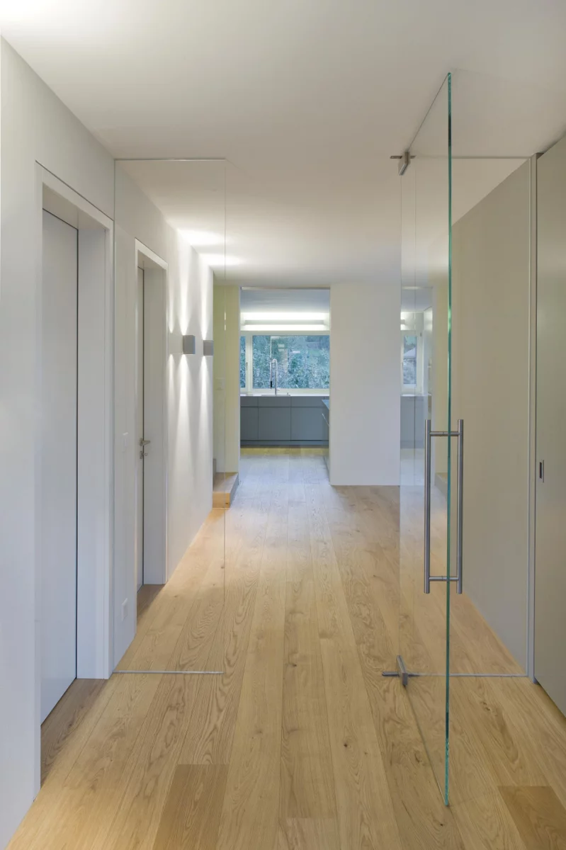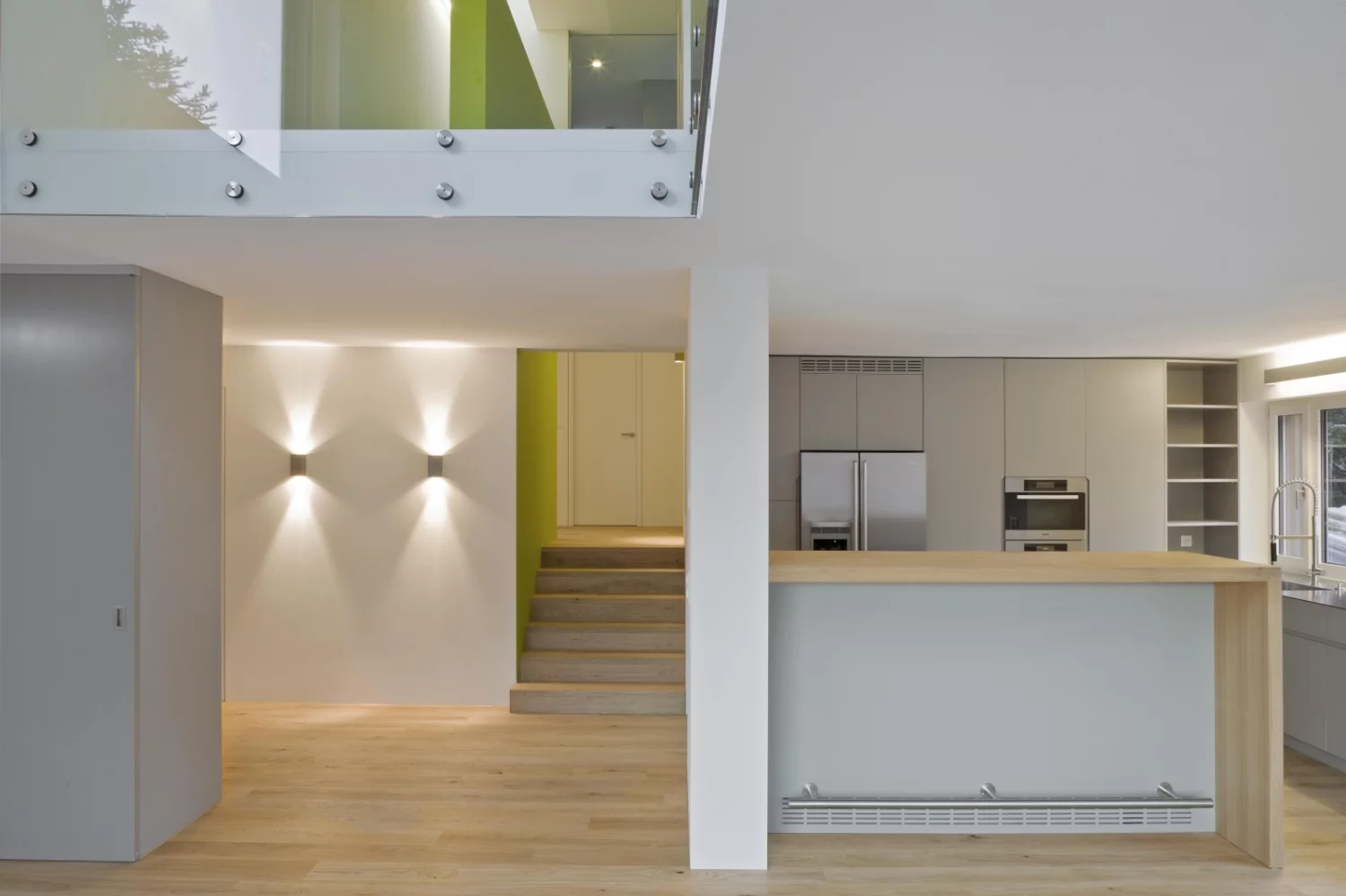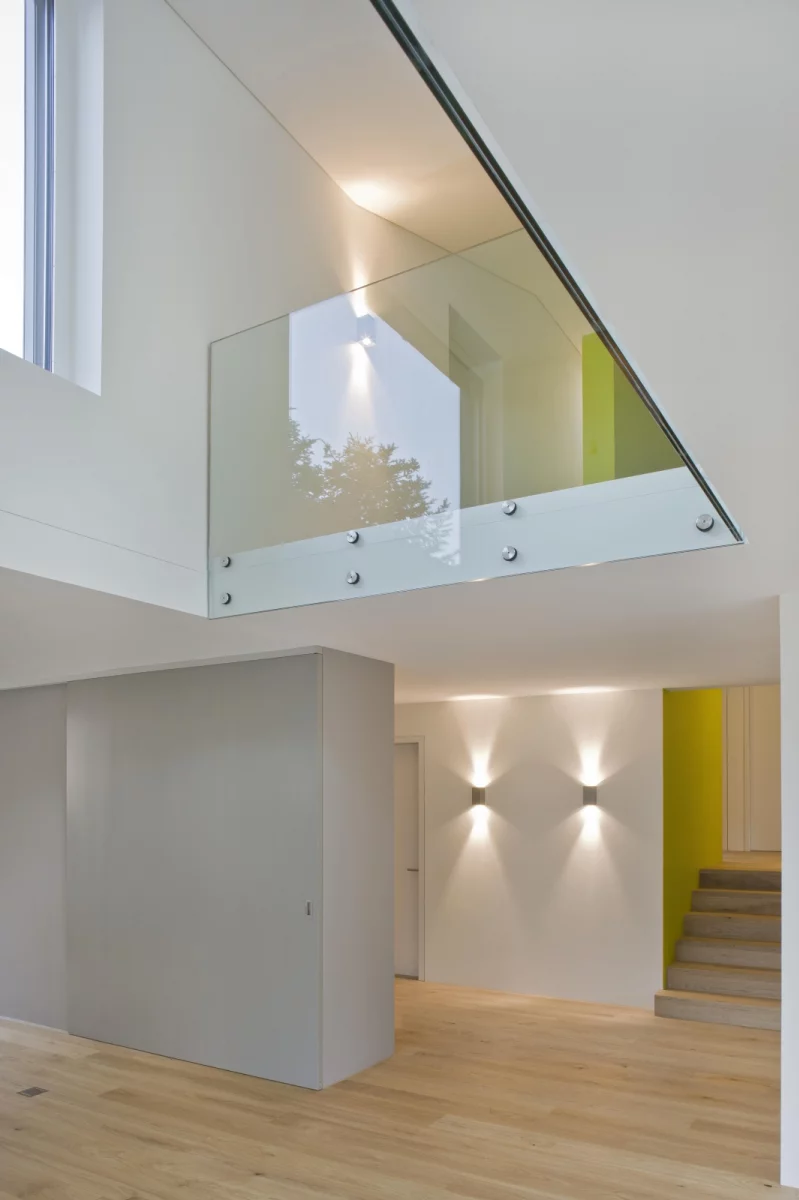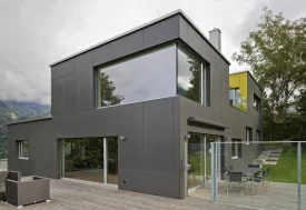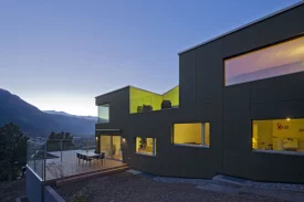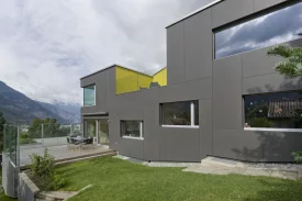 Aufgabe war die Sanierung und Erweiterung eines bestehenden, eingeschossigen Einfamilienhauses aus den 70-er Jahren. Das Giebeldach des Splittlevel - Gebäudes wurde entfernt und das Volumen um ein Geschoss erhöht. Dabei blieb die Grundstruktur des Baus fast unverändert. Der Aufbau ist aus vorfabrizierten Holzelementen gefertigt. Eine neue Fassadenverkleidung aus vorgehängten, dunkelgrauen Eternitplatten bekleidet das ganze Volumen und lässt Alt und Neu zu einem Ganzen verschmelzen. Die grosse Terrasse, die Loggia und das grosse Eckfenster bieten 270° - Aussicht über Brig und das Rhonetal.