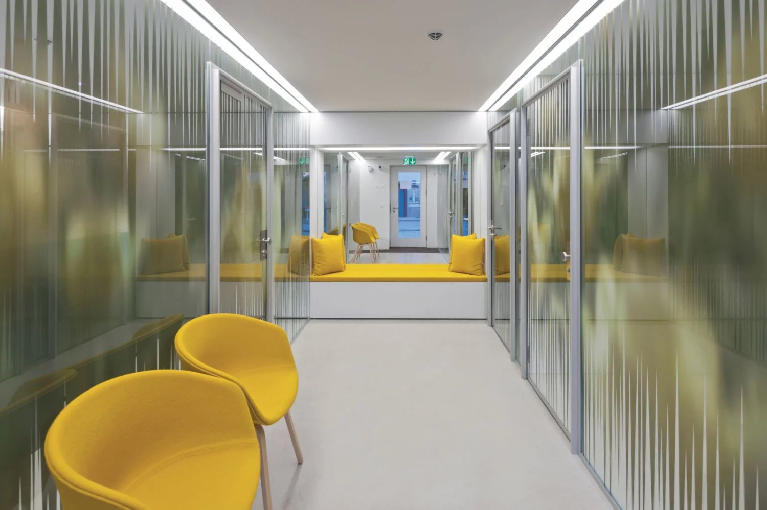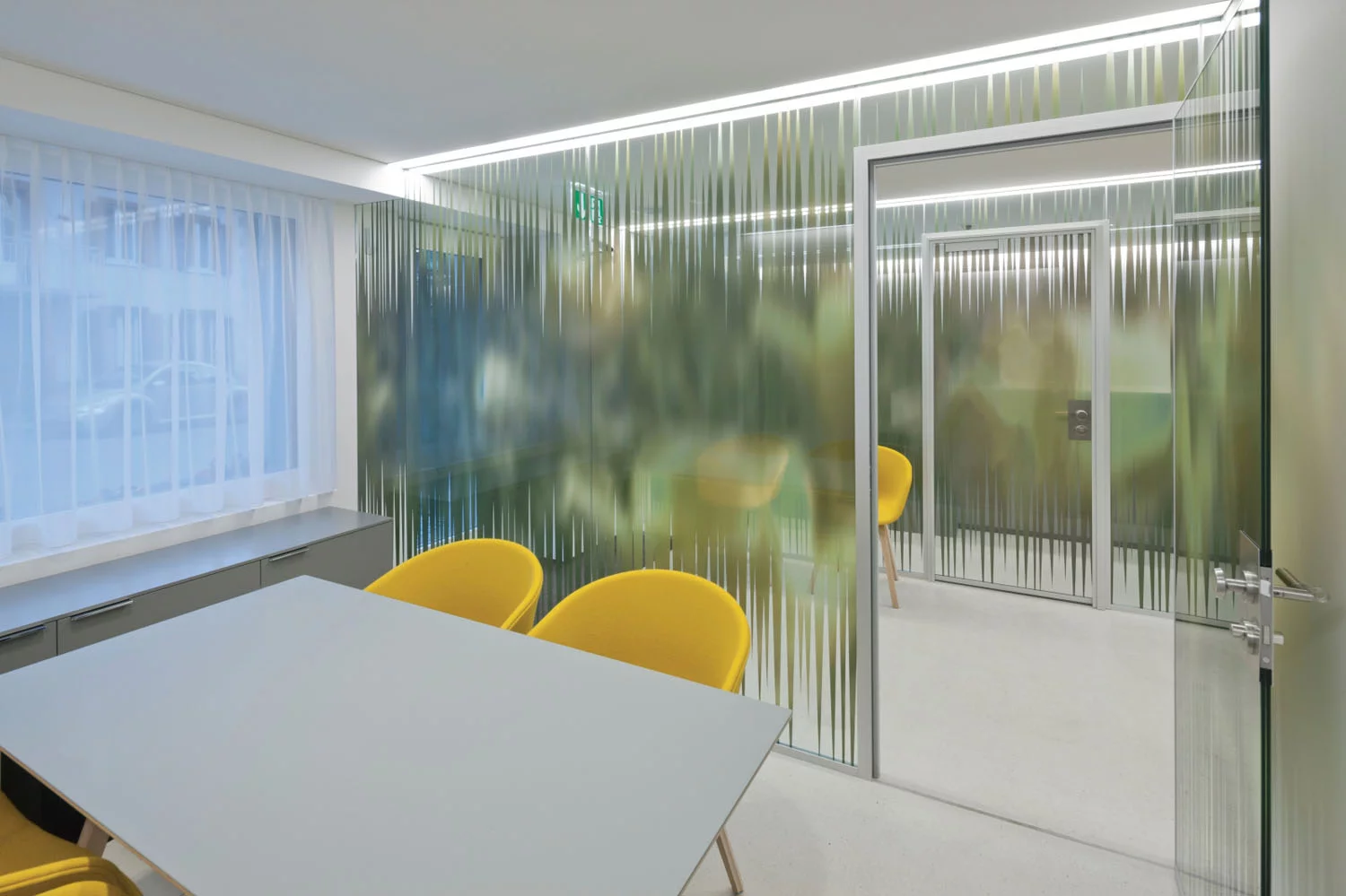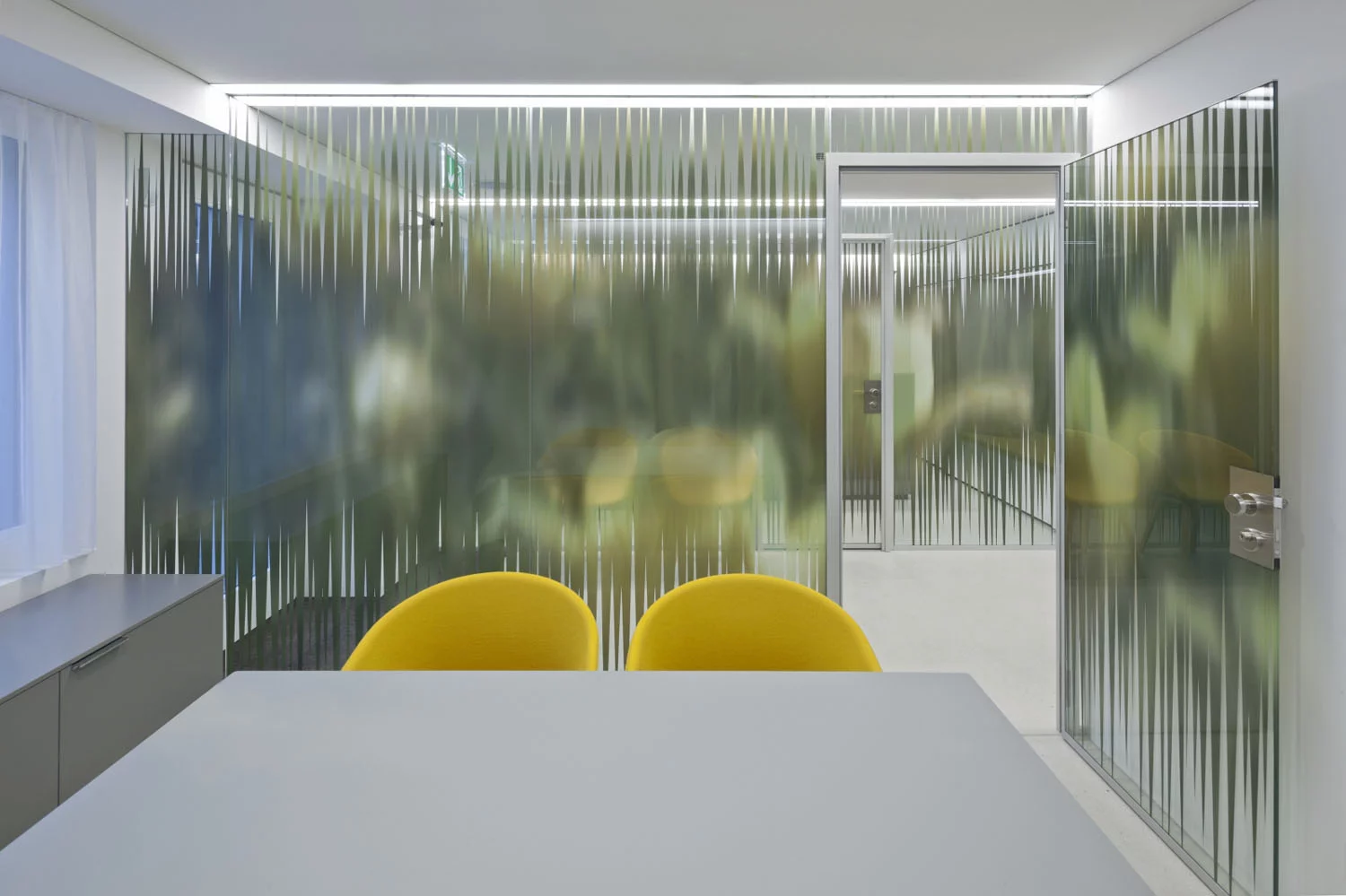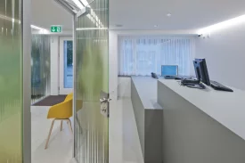 Die kleine Geschäftsstelle in Grengiols wurde komplett umgebaut. Die Fenster wurden vergrössert und von Profilen befreit, so wie die ursprünglichen Schaufenster waren. Der Raum wird neu durch zwei Glaswände in Wartezone, Schalterzone und Beratungszimmer unterteilt. Ein Spiegel dient der Raumerweiterung. Abstrahierte Tulpenbilder bilden den Sichtschutz auf dem Glas.