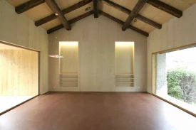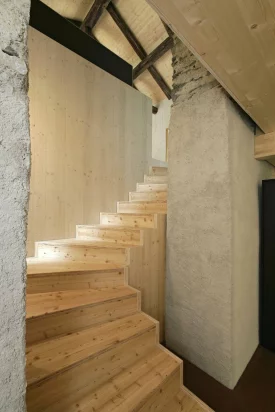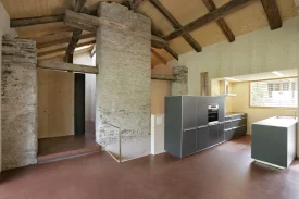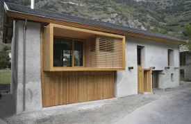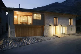 Die Umnutzung des alten Stall- und Scheunenbaus in ein Einfamilienhaus wird durch das sichtbare Einfügen eines Holzbaus in die bestehende Struktur thematisiert. Die bestehenden Fassadenöffnungen wurden erweitert und vergrössert. Das eingesetzte „Futter“ des Holzelementbaus stülpt sich an Vorder- und Rückfassade sichtbar über die Bruchsteinmauern nach aussen. Grosse Fenster gewähren Aussicht auf Kapelle und Garten. Im Innern kontrastieren die naturbelassenen Oberflächen der Holzelemente an Wänden und Decken mit den Wandscheiben aus Bruchsteinmauerwerk und den alten Dachbalken. Der Boden, ein rot eingefärbter Fliessestrich, zieht sich wie ein Teppich durch alle Räume. Von aussen wie von innen entsteht ein spannender Kontrast von Alt und Neu, Roh und Fein.